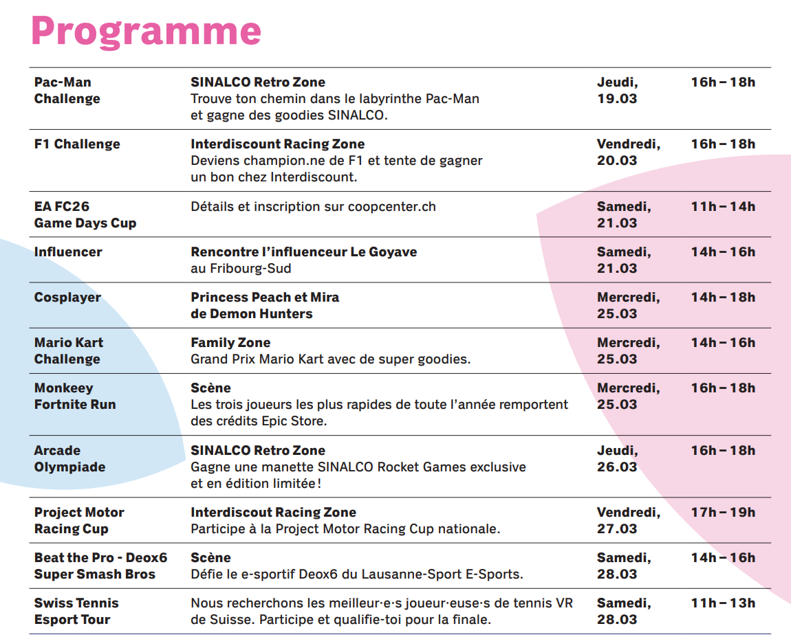 Du 19 au 31 mars 2026, les Game Days débarquent à Fribourg Sud! Plonge avec nous dans de nouveaux univers de gaming et vis des aventures inoubliables pendant les Game Days!